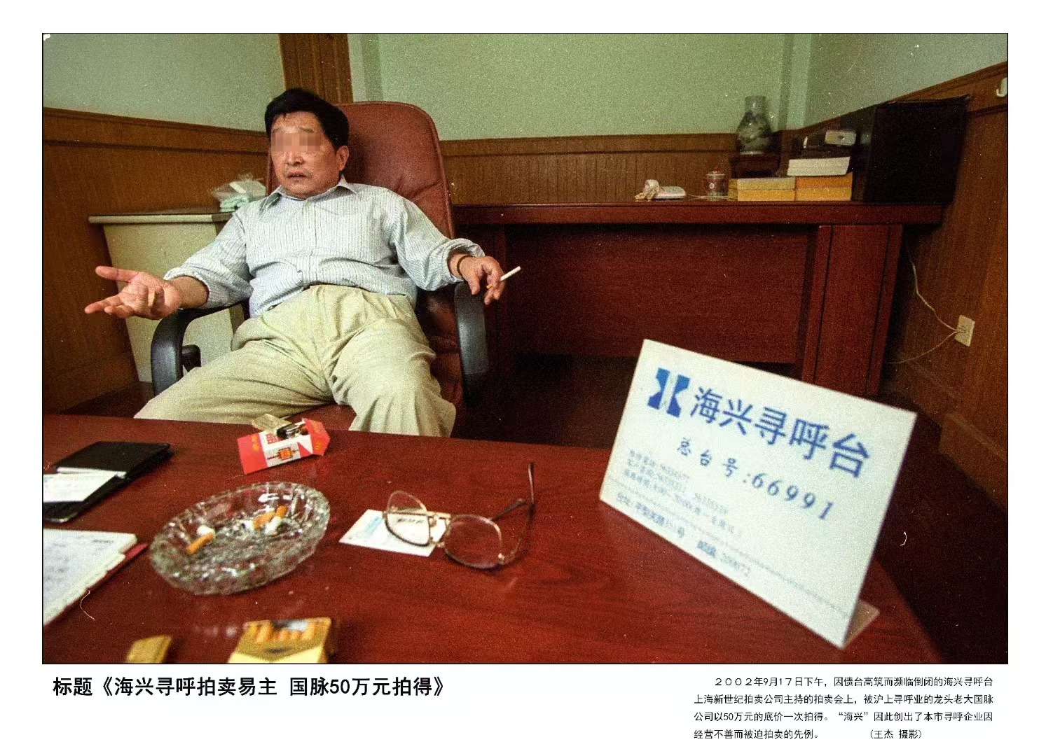 2002年9月17日,因債臺高筑而瀕臨倒閉的海興尋呼臺在上海新世紀拍賣公司主持的拍賣會上,被滬上尋呼業(yè)的龍頭老大國脈公司以50萬元的底價一次拍得。王杰 攝