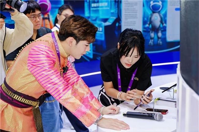 在南寧東盟博覽會人工智能專館,嗯噢哇科技的展臺前,一位游客正用泰語與智能助手"旅小哇"交流。"我想看看最具廣西特色的景點,"他說道。