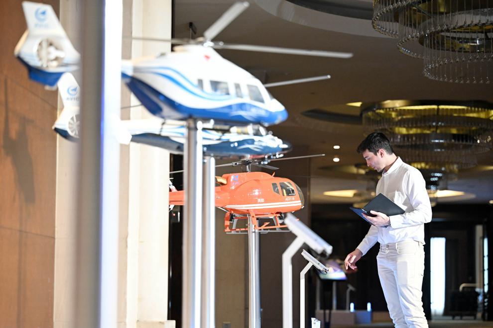 10月15日,與會嘉賓在論壇會場外參觀直升機(jī)模型展示。新華社記者 趙子碩 攝直升機(jī)是低空經(jīng)濟(jì)的重要組成部分。中國飛龍通用航空有限公司總經(jīng)理龔全表示,該公司旗下?lián)碛?3架直升機(jī),持續(xù)拓展應(yīng)急救援、飛行員培訓(xùn)等諸多低空經(jīng)濟(jì)場景。龔全認(rèn)為,近年來中國國產(chǎn)直升機(jī)在不同應(yīng)用場景下均展現(xiàn)出了良好的可靠性,將在低空經(jīng)濟(jì)中扮演重要角色。